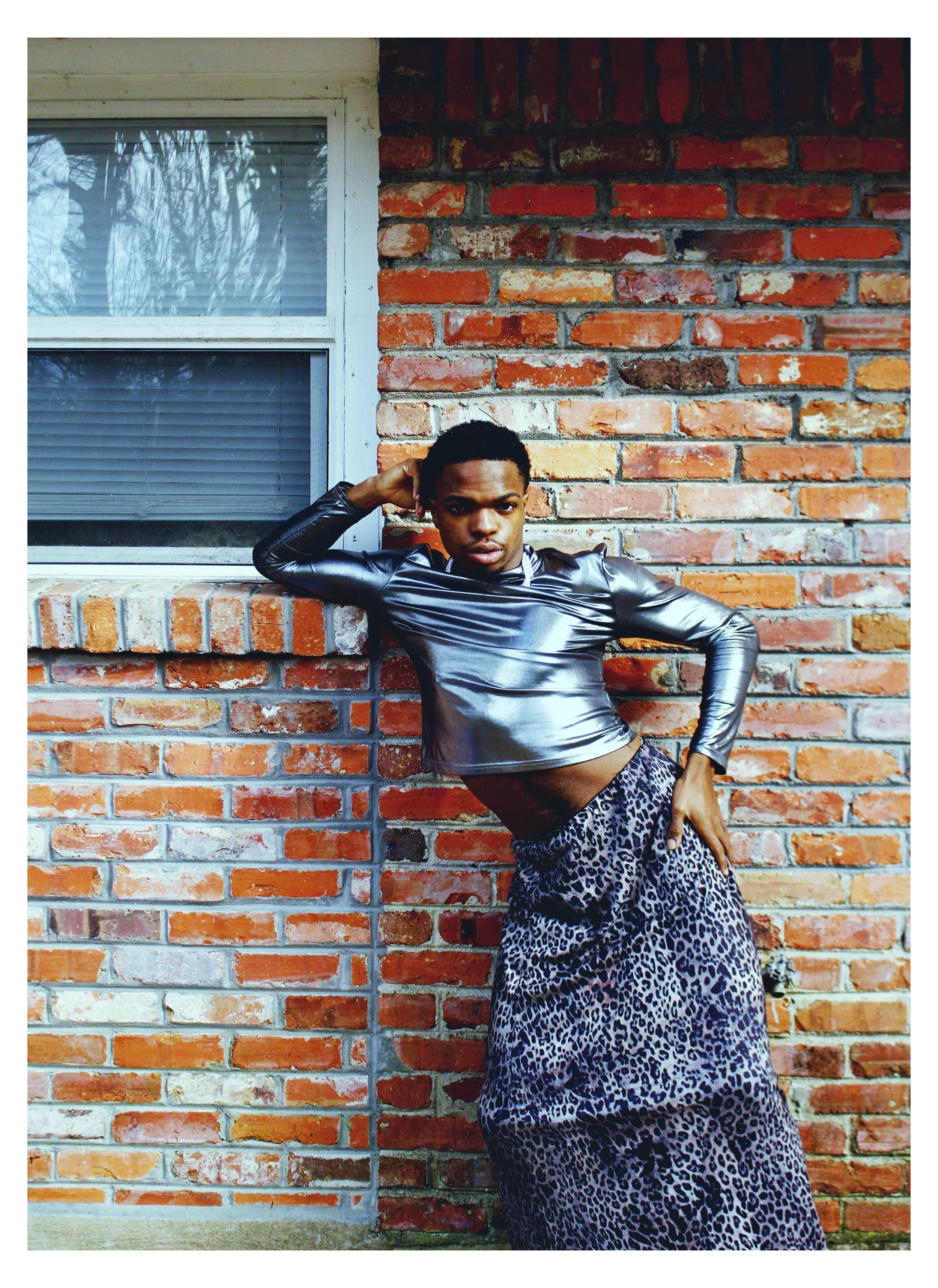 In this outfit—the pearls, chrome shirt, cheetah dress, white socks, and silver heels against a contrast brick wall— I am emphasizing that style is more than gender; it is about contextualization, individuality, and opportunity. It is about taking full risks and developing a style that not only wows people, but break down down the gender roles and norms that the industry has long imposed. Style is about creating art and pursuing the impossible, so you have to be just a confident and have a big ego.